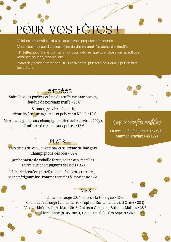 Le Chef vous propose en commande – 10 jours avant – une sélection de plats festifs et de vins en accord. Fêtes 2025